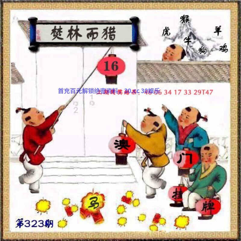 323期挂牌【焚林而猎】 解释:焚烧树林以猎取禽兽,焚烧解火肖蛇马,树林解木肖虎兔。挂:16 爆:马。 综合:马虎蛇兔龙鸡猪 |